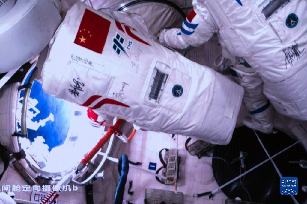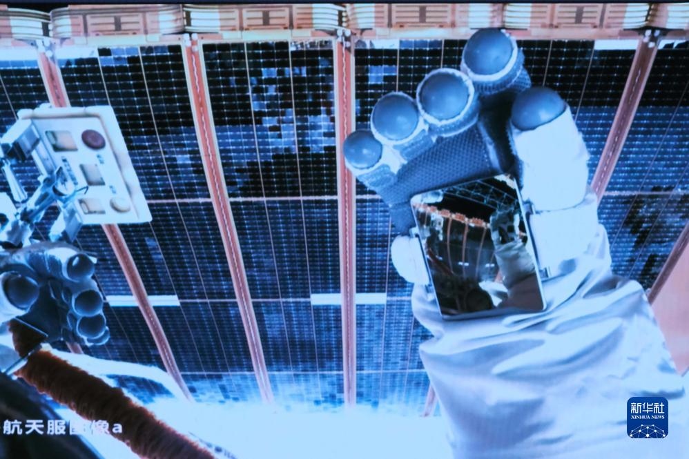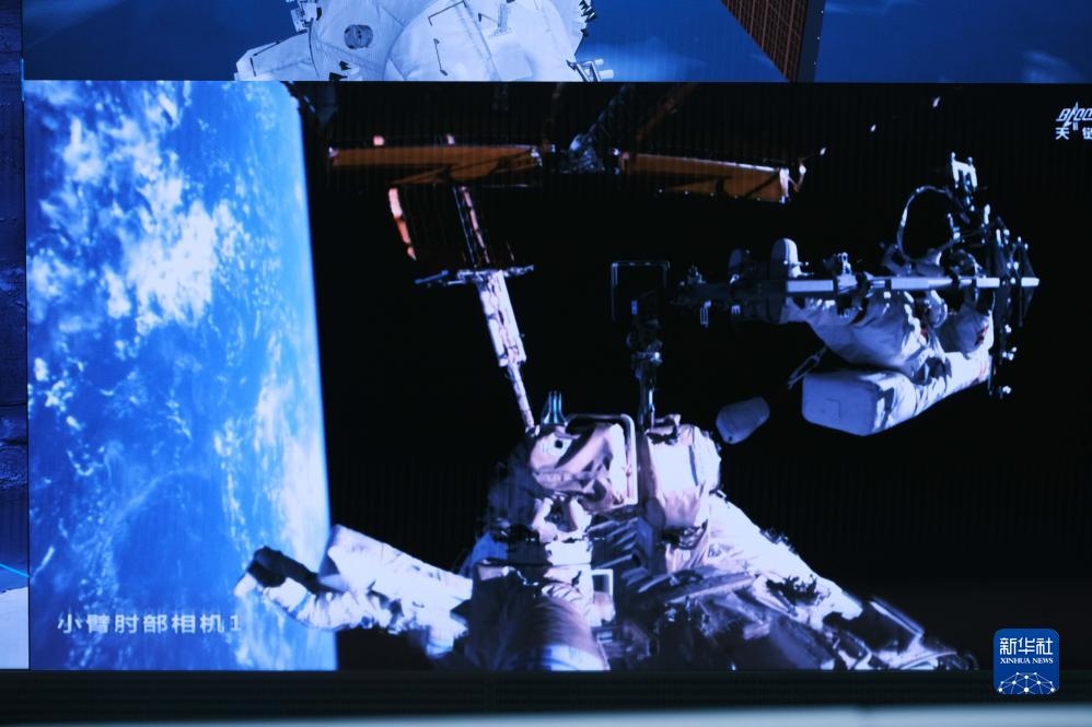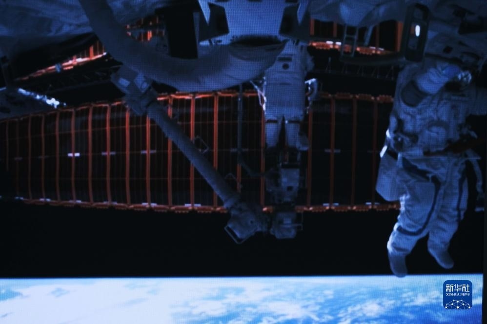 12月21日在北京航天飛行控制中心拍攝的神舟十七號航天員江新林協(xié)同兩名艙外航天員實(shí)施出艙活動的畫面。新華社記者 李杰 攝