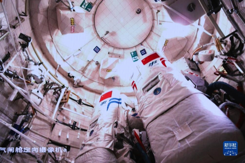 12月21日在北京航天飛行控制中心拍攝的神舟十七號航天員湯洪波(右)、唐勝杰返回問天實(shí)驗(yàn)艙并關(guān)閉艙門的畫面。新華社發(fā)(韓啟揚(yáng)攝)