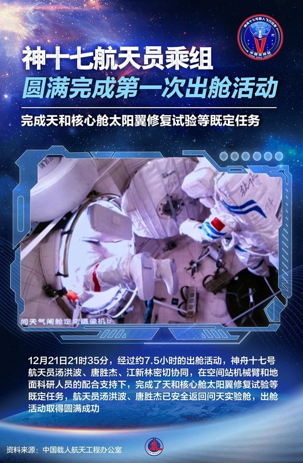 據(jù)中國載人航天工程辦公室介紹,21日21時35分,經(jīng)過約7.5小時的出艙活動,神舟十七號航天員湯洪波、唐勝杰、江新林密切協(xié)同,在空間站機(jī)械臂和地面科研人員的配合支持下,完成了天和核心艙太陽翼修復(fù)試驗(yàn)等既定任務(wù),航天員湯洪波、唐勝杰已安全返回問天實(shí)驗(yàn)艙,出艙活動取得圓滿成功。