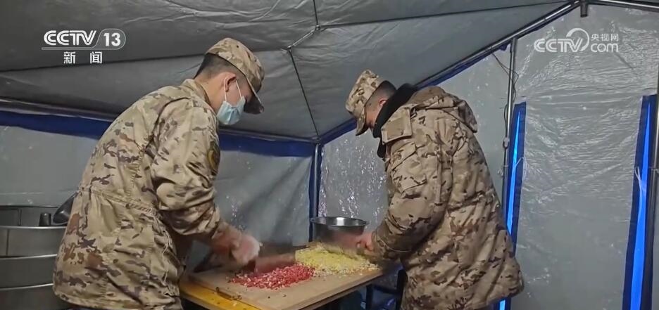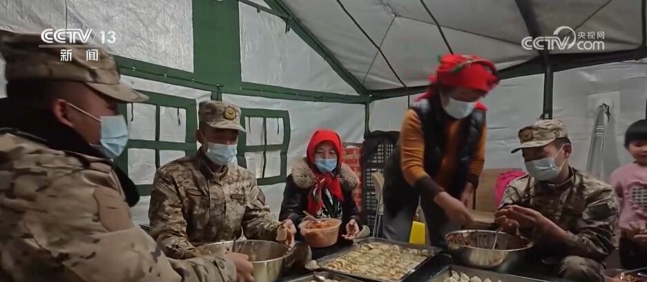 在青海民和中川鄉(xiāng)草灘村美一小學(xué)安置點,官兵們準(zhǔn)備食材和面剁餡,他們要在這個特殊的日子,讓受災(zāi)群眾吃上一碗熱騰騰的餃子。帳篷里,群眾和官兵分工協(xié)作,處處洋溢著“家”的溫馨。
