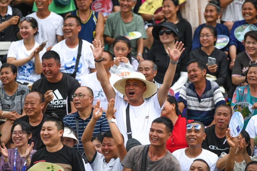 7月29日,觀眾在貴州榕江(三寶侗寨)和美鄉(xiāng)村足球超級聯(lián)賽年度總決賽的現(xiàn)場歡呼。新華社記者 楊文斌 攝