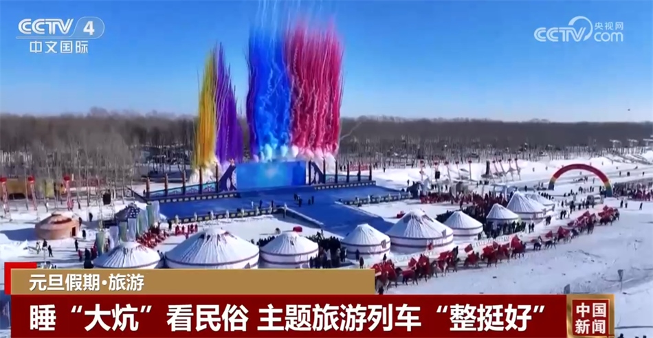 總臺(tái)央視記者 楊曜語(yǔ):我即將登上的列車就是從哈爾濱開(kāi)往漠河的國(guó)內(nèi)首個(gè)沉浸式東北民俗文化體驗(yàn)列車,坐過(guò)的人都說(shuō)一上車就想盤(pán)腿兒了,我們趕緊來(lái)體驗(yàn)一下!一上車我就被濃濃的東北文化所感染到了,整個(gè)車廂都被東北大花的經(jīng)典配色裝飾著,再加上隨手就能品嘗到東北特色美食,坐在床鋪上就感覺(jué)一秒鐘“穿越”到農(nóng)家炕頭。