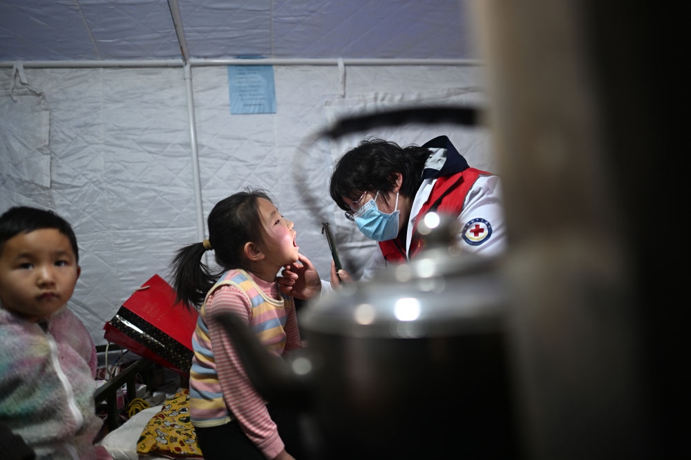 在青海省海東市民和回族土族自治縣官亭鎮(zhèn)喇家村安置點,山東援青醫(yī)生李鴻皓(右)為喇生婷檢查身體(12月23日攝)。積石山6.2級地震發(fā)生以來,在青海省海東市民和回族土族自治縣,當?shù)蒯t(yī)療機構(gòu)和援青醫(yī)療隊通過設(shè)立醫(yī)療點、開展巡診等方式保障安置點群眾就醫(yī)服務,守護群眾健康。新華社記者 張宏祥 攝