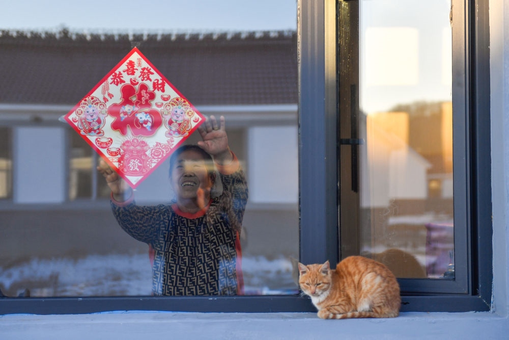 吉林省舒蘭市開原鎮(zhèn)新開村村民徐中仁在新房子中貼“福”字(12月7日攝)。新華社記者 許暢 攝