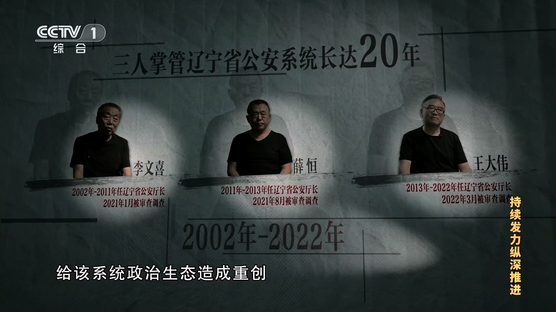 【解說詞】連續(xù)三任省公安廳長都自身不正,自然也完全棄守全面從嚴治黨主體責任,管黨治警長期處于寬松軟狀態(tài),導致遼寧公安系統(tǒng)出現高層次、大面積、持續(xù)性的腐敗。僅2021年以來,和王大偉同一個班子的6名省公安廳黨委委員被查處,全省省管公安政法干部共43人被查處,涉及半數以上的省廳偵查警種或部門“一把手”、現任或曾任的市公安局長。