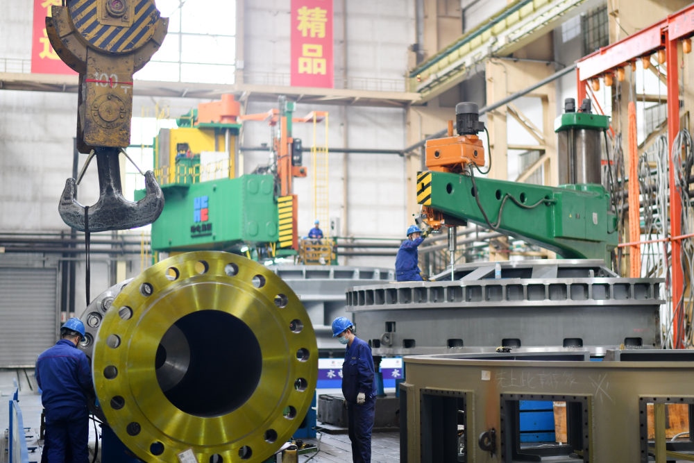 工人在哈電集團(tuán)哈爾濱電機(jī)廠有限責(zé)任公司生產(chǎn)車間作業(yè)(2023年4月11日攝)。新華社記者 王建威 攝