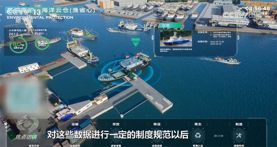 如何能夠證明這些塑料垃圾是來自海洋、岸灘而不是陸地呢?浙江是數(shù)字技術(shù)大省,大數(shù)據(jù)在這里發(fā)揮了重要作用。在藍景科技的后臺上,我們看到了整個臺州海域的所有漁船,包括漁船實時的定位、船速等等信息,通過這些數(shù)據(jù),藍景能夠推斷并掌握漁船真實的垃圾產(chǎn)生情況。這些數(shù)據(jù),大部分來源于政府。浙江省在2020年啟動政府數(shù)據(jù)開放,鼓勵符合條件的企業(yè)參與政府數(shù)據(jù)的開發(fā)利用,激發(fā)數(shù)據(jù)要素價值。臺州市積極實踐,經(jīng)過對接、評估,向藍景開放一部分數(shù)據(jù)。