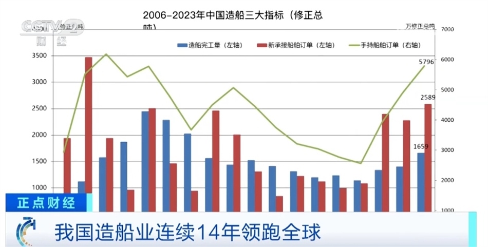 總臺央視記者 吳天白:在2023年中國造船業(yè)統(tǒng)計數(shù)據(jù)中,我們還可以看到三大指標占國際市場份額分別是50.2%、66.6%和55.0%,首次全部超過50%。從這幾張數(shù)據(jù)圖中,我們可以看出,我國高技術(shù)、高價值船型的新接訂單量創(chuàng)2008年以來新高,在這里我們可以看到中國新接綠色動力船舶訂單占國際市場的份額也是連年增長,2023年全年已經(jīng)達到了57%。這也表明了未來全球一半以上的新能源船都將產(chǎn)自中國。