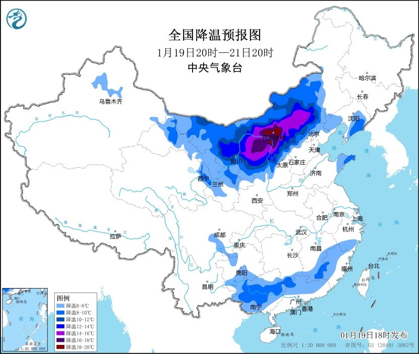 預(yù)計,1月19日20時至1月21日20時,西北地區(qū)東部、內(nèi)蒙古中西部、華北北部、華南等地的部分地區(qū)將降溫8~12℃,其中,內(nèi)蒙古河套地區(qū)和中部、陜西北部、山西北部、河北西北部等地部分地區(qū)降溫可達(dá)14~16℃,局地可超過18℃。