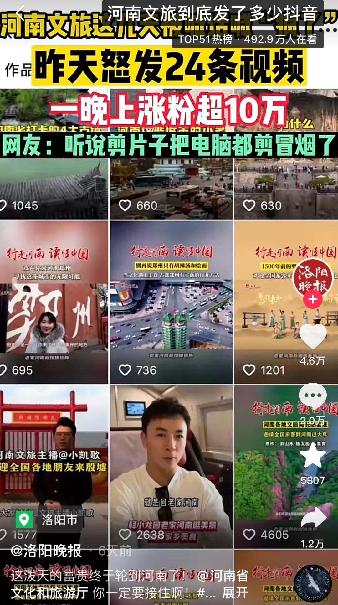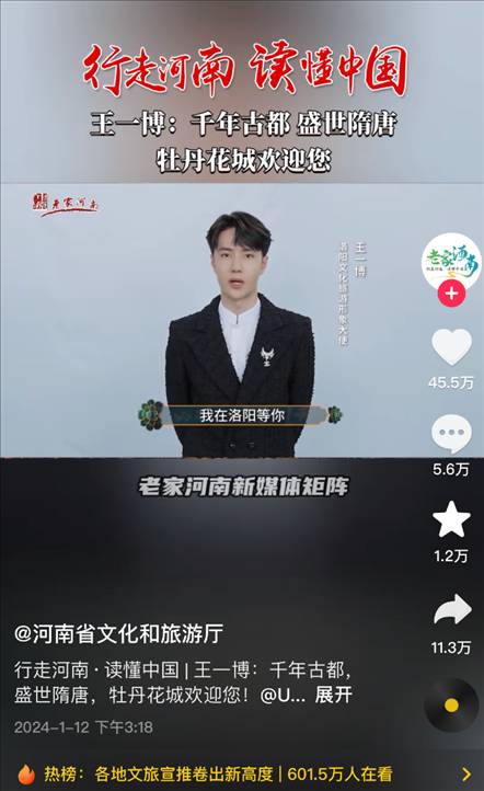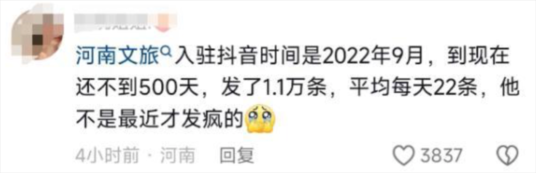 有人統(tǒng)計(jì),自1月9日起,河南文旅官方賬號(hào)“河南省文化和旅游廳”每天發(fā)布二三十條視頻,連續(xù)四天發(fā)布了112條視頻,持續(xù)展示本地文旅資源,吸引了近百萬(wàn)新粉絲,主打一個(gè)“量變總會(huì)引起質(zhì)變”,以至于“河南文旅到底發(fā)了多少抖音”相關(guān)話題成為熱門搜索。