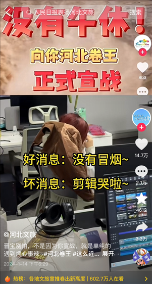 有網(wǎng)友建議賬號(hào)改名為“河北文旅”,“不然都搜不到”,“聽(tīng)勸”的官方賬號(hào)火速改名,并發(fā)布視頻“宣戰(zhàn)”,“山河四省互不內(nèi)卷?xiàng)l約正式結(jié)束,今天這個(gè)卷王我當(dāng)定了”,于是開(kāi)始“瘋狂輸出”,日更75條,可還了得?