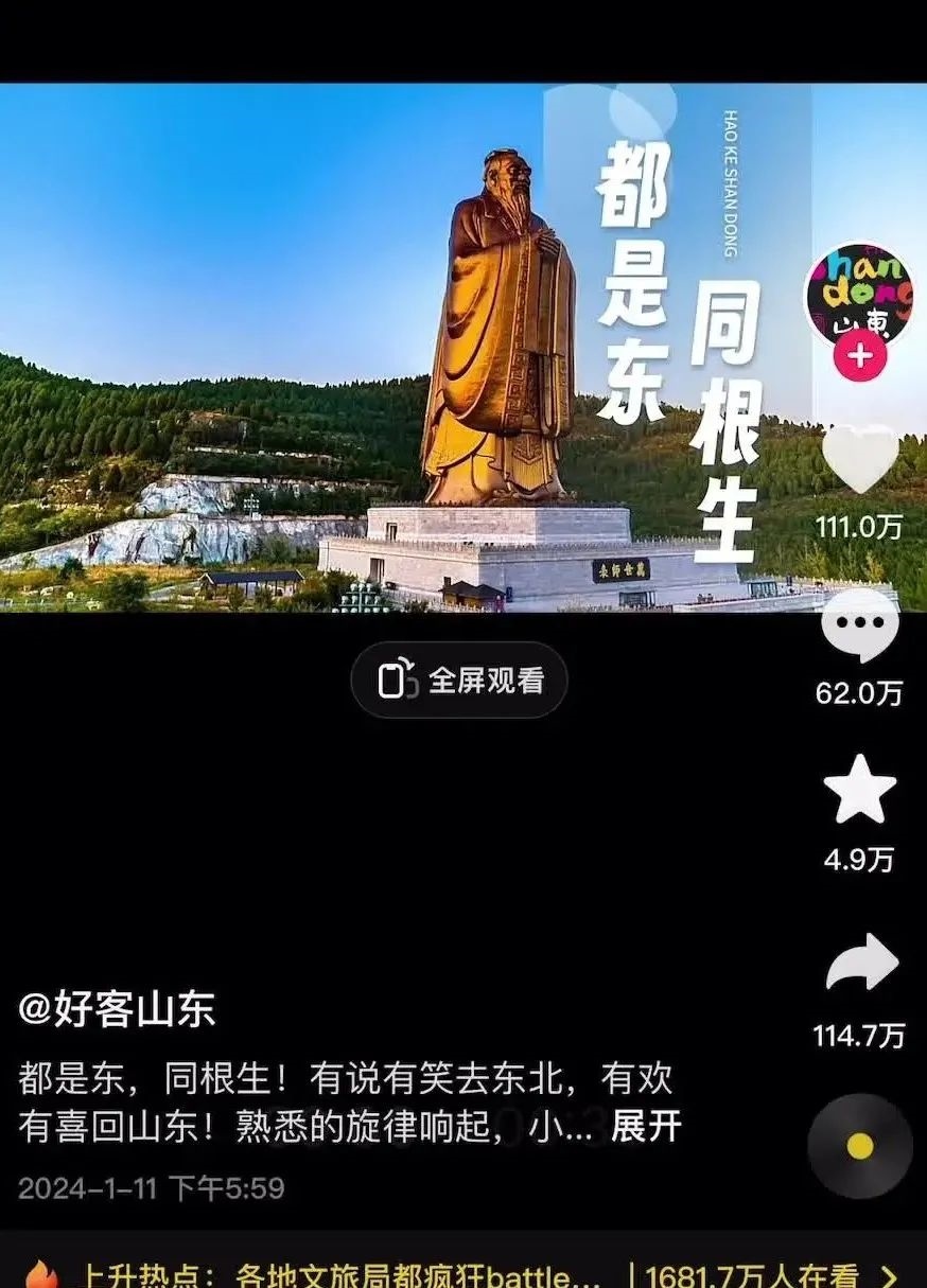 有說(shuō)有笑去東北,有歡有喜回山東……”山東文旅呢,用一條“我姓東”的土味視頻把自己送上了熱搜,目前超111萬(wàn)網(wǎng)友點(diǎn)贊。