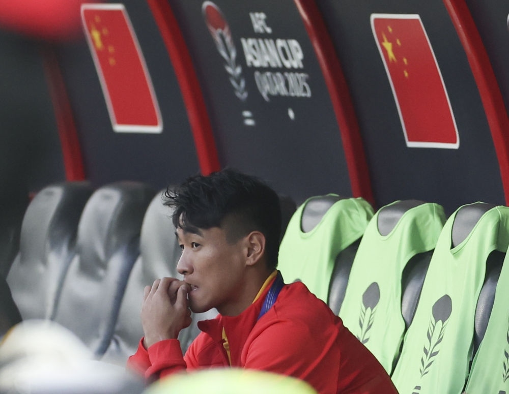 1月13日,中國隊(duì)對(duì)陣塔吉克斯坦隊(duì),圖為因傷未能進(jìn)入名單的韋世豪賽前在替補(bǔ)席上。新華社記者 曹燦 攝