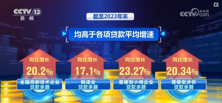 截至2023年末,全國(guó)高新技術(shù)企業(yè)貸款余額同比增長(zhǎng)20.2%,制造業(yè)貸款余額同比增長(zhǎng)17.1%,普惠型小微企業(yè)貸款余額同比增長(zhǎng)23.27%,普惠型涉農(nóng)貸款余額同比增長(zhǎng)20.34%,均高于各項(xiàng)貸款平均增速。