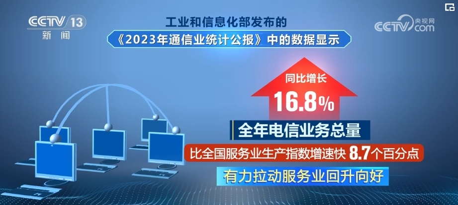 《統(tǒng)計(jì)公報(bào)》數(shù)據(jù)顯示,2023年,電信業(yè)務(wù)量收雙增,全年電信業(yè)務(wù)總量同比增長(zhǎng)16.8%,比全國(guó)服務(wù)業(yè)生產(chǎn)指數(shù)增速快8.7個(gè)百分點(diǎn),有力拉動(dòng)服務(wù)業(yè)回升向好。