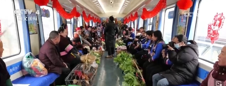 在貴州,有一趟往返于貴陽(yáng)與玉屏之間的“慢火車(chē)”5640次列車(chē),里面專(zhuān)設(shè)了一個(gè)農(nóng)特產(chǎn)品車(chē)廂。新春臨近,村民們將自家養(yǎng)殖的土雞、雞蛋,熏制的香腸、臘肉,以及水果、蔬菜帶上列車(chē),向旅客現(xiàn)場(chǎng)售賣(mài)。