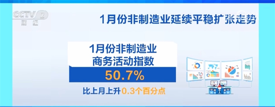 此外,1月份非制造業(yè)商務(wù)活動(dòng)指數(shù)為50.7%,比上月上升0.3個(gè)百分點(diǎn),延續(xù)平穩(wěn)擴(kuò)張走勢(shì)。其中,服務(wù)業(yè)商務(wù)活動(dòng)指數(shù)升至擴(kuò)張區(qū)間,景氣面也有所擴(kuò)大。在節(jié)日效應(yīng)帶動(dòng)下,零售、道路運(yùn)輸、餐飲等行業(yè)商務(wù)活動(dòng)指數(shù)升至擴(kuò)張區(qū)間。郵政、貨幣金融服務(wù)等行業(yè)業(yè)務(wù)量增長(zhǎng)較快。