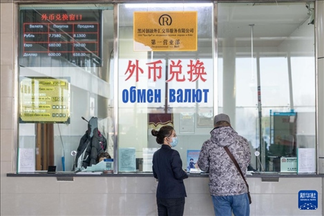 1月30日,在黑河水運口岸出境大廳,工作人員幫助游客辦理外幣兌換業(yè)務。新華社記者 謝劍飛 攝