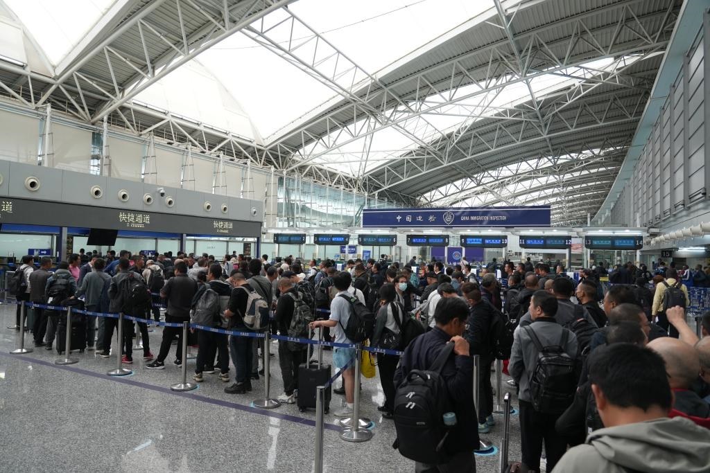 1月30日,中外游客在黑河水運口岸出境大廳等候進入出境通道。新華社記者 謝劍飛 攝