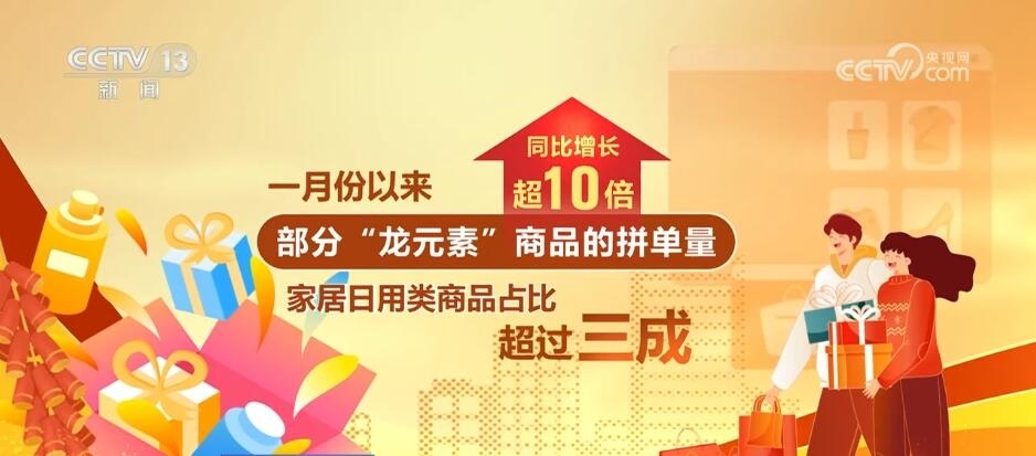 “龍?jiān)亍碑?dāng)仁不讓地成為今年春節(jié)的新“頂流”,不光有龍年的福字對(duì)聯(lián),還有龍年臺(tái)歷、龍寶寶毛絨玩具、龍年紅色內(nèi)衣、龍年中國結(jié)掛飾成為最熱銷的春節(jié)周邊商品前五名。1月份以來,部分“龍?jiān)亍鄙唐返钠磫瘟客仍鲩L超10倍,其中,家居日用類商品占比超過三成。