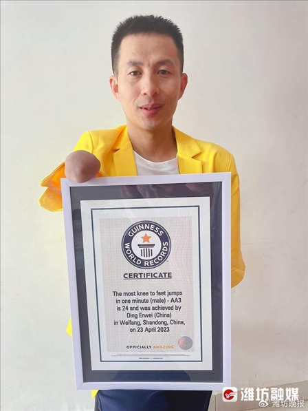 山東濰坊,42歲的丁二偉在8歲時(shí),因?yàn)檎{(diào)皮摸了村里的變壓器造成雙臂截肢。他當(dāng)了11年殘疾人長(zhǎng)跑運(yùn)動(dòng)員,退役已經(jīng)有10年了。2日,他收到吉尼斯總部寄來的證書,挑戰(zhàn)的項(xiàng)目是一分鐘跪跳起,他一分鐘跳了24個(gè),是跪跳起跳得最多的人。