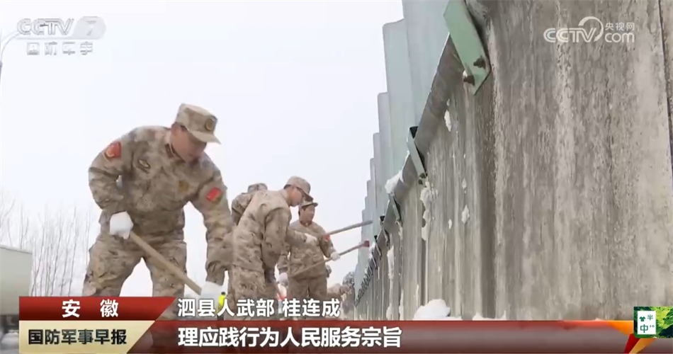 在安徽泗縣,當?shù)厝宋洳拷M織民兵協(xié)助開展道路鏟雪、除冰工作,確保返鄉(xiāng)人員平安回家。
