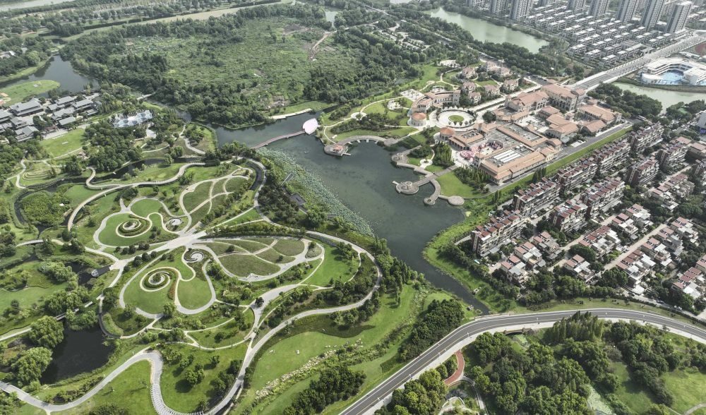 位于浙江省湖州市八里店鎮(zhèn)的西山漾國家城市濕地公園和周邊的居民區(qū)相互融合(無人機照片,2023年8月23日攝)。新華社記者 翁忻旸 攝