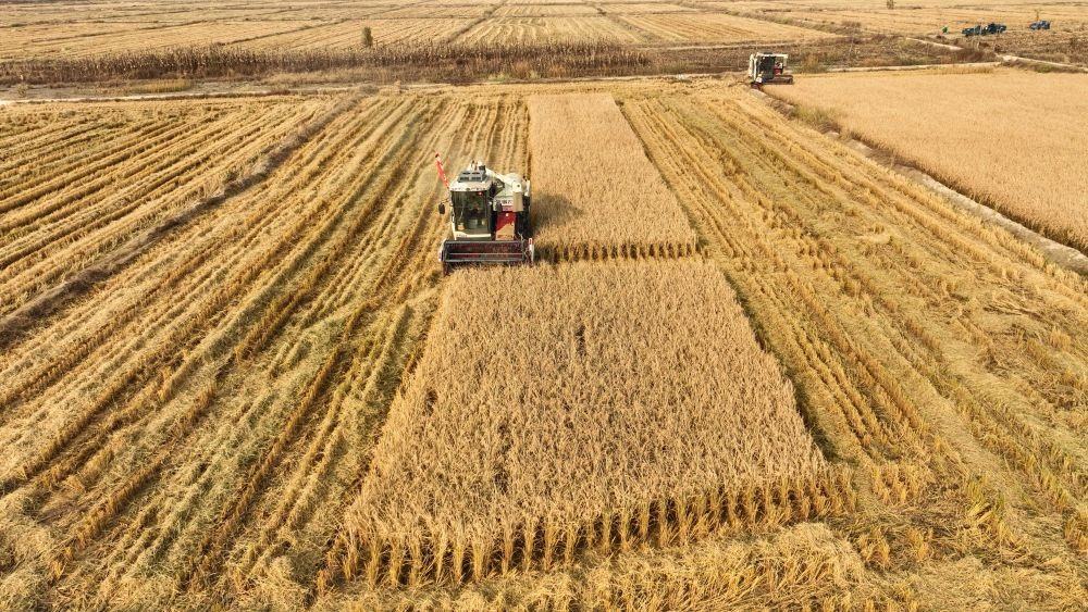 2023年10月23日,水稻收割機在遼寧省阜新市彰武縣大冷鎮(zhèn)上三家子村的稻田中收割水稻(無人機照片)。新華社記者 龍雷 攝
