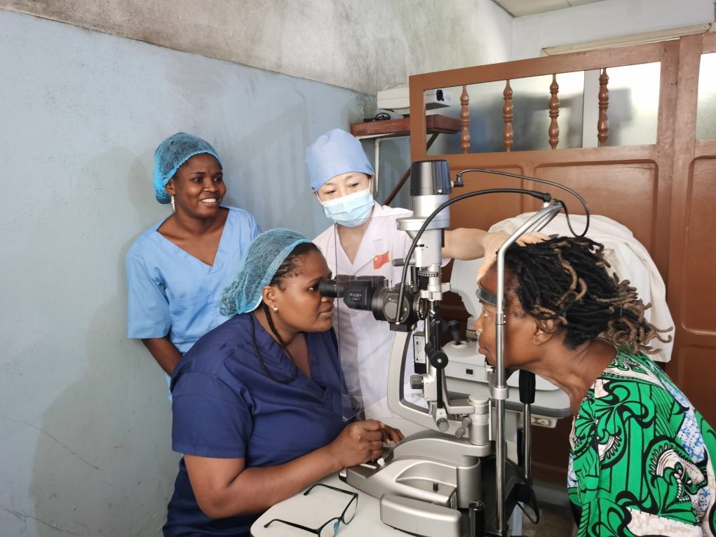 1月31日,在貝寧莫諾和庫(kù)福省中心醫(yī)院眼科診室,中國(guó)援貝寧醫(yī)療隊(duì)醫(yī)生正指導(dǎo)當(dāng)?shù)刈o(hù)士為患者做檢查。