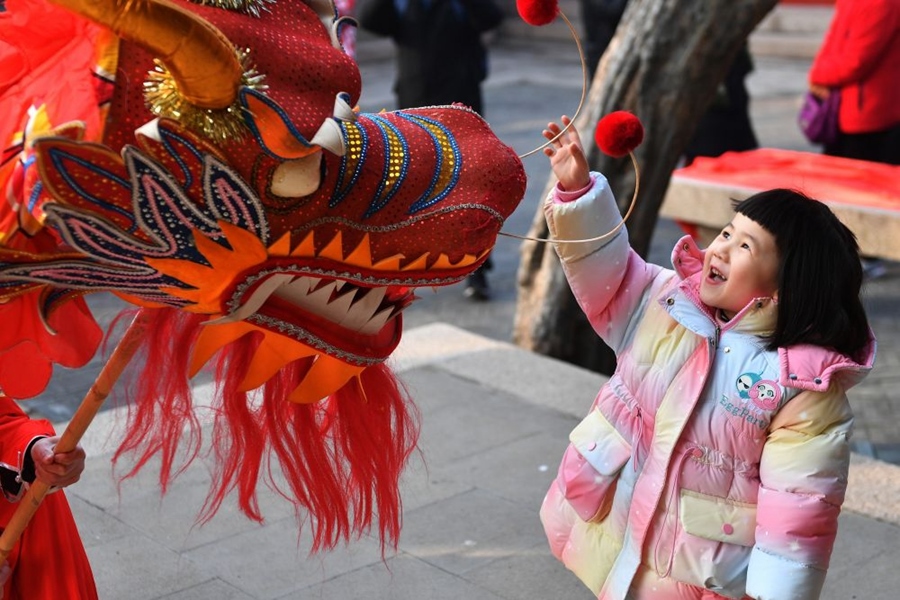 2024年2月10日,在山東省青島市市南區(qū)天后宮舉行的民俗文化廟會(huì)上,一名小朋友在觀看舞龍祈福表演。新華社發(fā)(王海濱 攝)