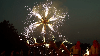 引龍出洞(火流星表演):舞龍人把燒紅的木炭放入小鐵籠中,系在長(zhǎng)繩一端,他手握長(zhǎng)繩,飛快地?fù)]動(dòng)繩子,使鐵籠和木炭在空中飛轉(zhuǎn),流光溢彩,讓人挪不開眼。
