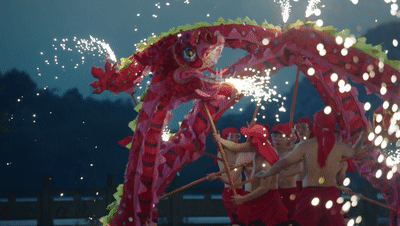 舞火龍的場(chǎng)子必須大、光線弱才好看。一場(chǎng)演出約10分鐘,通常是兩條龍,8個(gè)火爐的演出配置,一切準(zhǔn)備就緒,精彩的銅梁火龍表演就開始了: