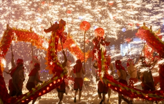 生龍活現(xiàn)(放煙花):登場(chǎng)的兩條龍,點(diǎn)燃提前放置的焰火筒,在龍珠的帶領(lǐng)下,形成“口中火”“脊上火”“腹中火”“導(dǎo)引火”的立體方陣,熱烈多彩。