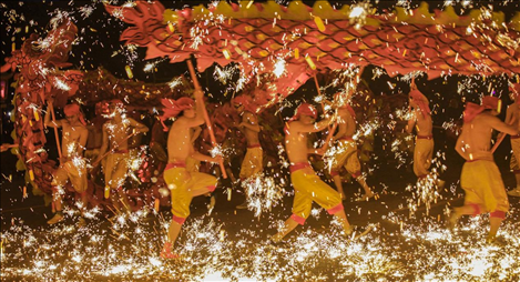 銅梁龍舞是首批國家級(jí)非物質(zhì)文化遺產(chǎn),被譽(yù)為“中華第一龍”。1500℃的鐵水瞬間在空中炸開,綻放成美麗的煙花雨。