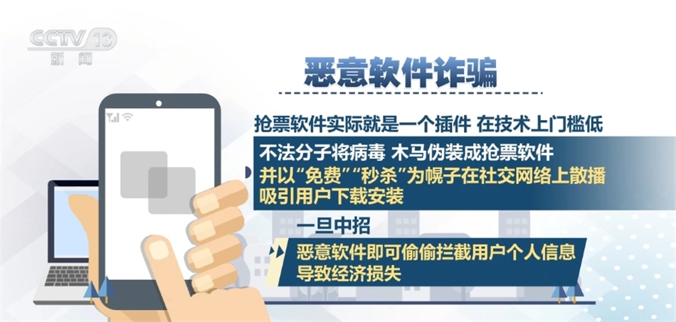 惡意軟件詐騙:搶票軟件實際就是一個插件,在技術(shù)上門檻低,不法分子將病毒、木馬偽裝成搶票軟件,并以“免費”“秒殺”為幌子在社交網(wǎng)絡(luò)上散播,吸引用戶下載安裝。一旦中招,惡意軟件即可偷偷攔截用戶個人信息,導(dǎo)致經(jīng)濟(jì)損失。