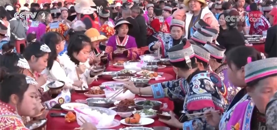 隨后,三合苗寨圍繞著“花樹”擺起長桌宴,苗族同胞和游客們一起喝起水花酒、跳起蘆笙舞,一起歡慶新春到來。今年春節(jié)期間,安順各地將舉行上百場苗族跳花活動。