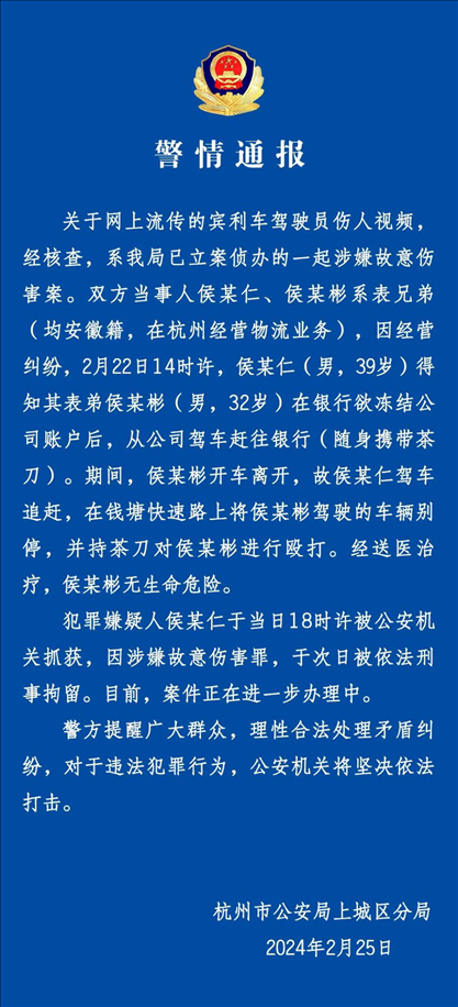 ·杭州警方通報(bào)“賓利司機(jī)傷人”案件,當(dāng)事雙方系表兄弟,因經(jīng)營(yíng)糾紛而出現(xiàn)別車、毆打的情況,犯罪嫌疑人被刑拘。
