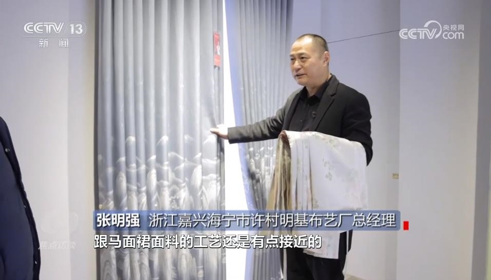 浙江嘉興海寧市許村明基布藝廠總經(jīng)理張明強(qiáng):“提花其實(shí)比較接近,跟馬面裙面料的工藝有點(diǎn)接近,但是馬面裙的密度會(huì)超過(guò)它很多?!?/p>