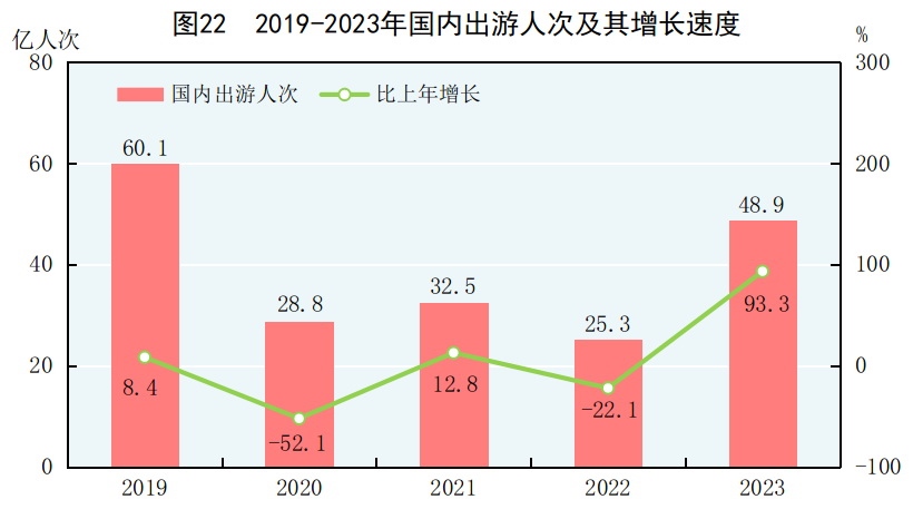 全年國內(nèi)出游48.9億人次,比上年增長93.3%。其中,城鎮(zhèn)居民國內(nèi)出游37.6億人次,增長94.9%;農(nóng)村居民國內(nèi)出游11.3億人次,增長88.5%。國內(nèi)游客出游總花費(fèi)49133億元,增長140.3%。其中,城鎮(zhèn)居民出游花費(fèi)41781億元,增長147.5%;農(nóng)村居民出游花費(fèi)7353億元,增長106.4%。入境游客8203萬人次,其中外國人1378萬人次,香港、澳門和臺灣同胞6824萬人次。入境游客總花費(fèi)530億美元。國內(nèi)居民出境10096萬人次,其中因私出境9684萬人次,赴港澳臺出境7704萬人次。