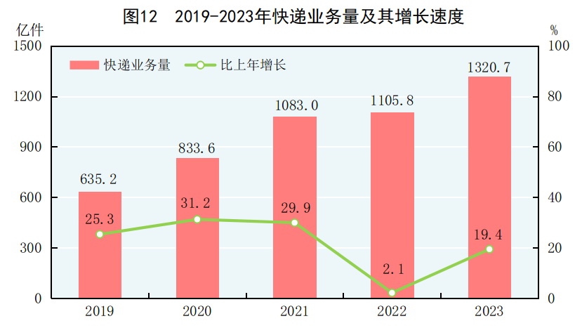 全年完成郵政行業(yè)寄遞業(yè)務(wù)總量[29]1625億件,比上年增長16.8%。郵政業(yè)完成郵政函件業(yè)務(wù)9.7億件,包裹業(yè)務(wù)0.2億件,快遞業(yè)務(wù)量1320.7億件,快遞業(yè)務(wù)收入12074億元。全年完成電信業(yè)務(wù)總量[30]18327億元,比上年增長16.8%。年末移動電話基站數(shù)[31]1162萬個(gè),其中4G基站629萬個(gè),5G基站338萬個(gè)。全國電話用戶總數(shù)189992萬戶,其中移動電話用戶172660萬戶。移動電話普及率為122.5部/百人。固定互聯(lián)網(wǎng)寬帶接入用戶[32]63631萬戶,比上年末增加4666萬戶,其中100M速率及以上的寬帶接入用戶[33]60136萬戶,增加4756萬戶。蜂窩物聯(lián)網(wǎng)終端用戶[34]23.32億戶,增加4.88億戶?;ヂ?lián)網(wǎng)上網(wǎng)人數(shù)10.92億人,其中手機(jī)上網(wǎng)人數(shù)10.91億人。互聯(lián)網(wǎng)普及率為77.5%,其中農(nóng)村地區(qū)互聯(lián)網(wǎng)普及率為66.5%。全年移動互聯(lián)網(wǎng)用戶接入流量3015億GB,比上年增長15.2%。軟件和信息技術(shù)服務(wù)業(yè)[35]完成軟件業(yè)務(wù)收入123258億元,比上年增長13.4%。