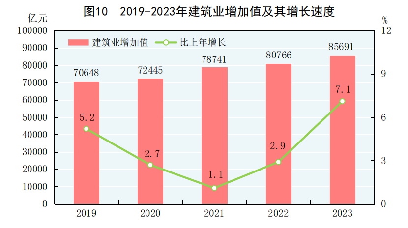 全年建筑業(yè)增加值85691億元,比上年增長7.1%。全國具有資質(zhì)等級的總承包和專業(yè)承包建筑業(yè)企業(yè)利潤8326億元,比上年增長[27]0.2%,其中國有控股企業(yè)4019億元,增長4.3%。