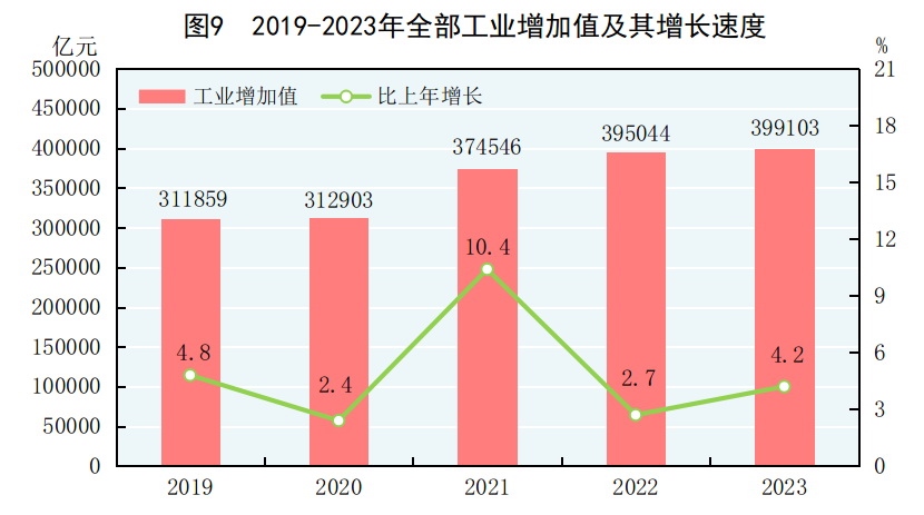 全年全部工業(yè)增加值399103億元,比上年增長4.2%。規(guī)模以上工業(yè)增加值增長4.6%。在規(guī)模以上工業(yè)中,分經(jīng)濟(jì)類型看,國有控股企業(yè)增加值增長5.0%;股份制企業(yè)增長5.3%,外商及港澳臺商投資企業(yè)增長1.4%;私營企業(yè)增長3.1%。分門類看,采礦業(yè)增長2.3%,制造業(yè)增長5.0%,電力、熱力、燃?xì)饧八a(chǎn)和供應(yīng)業(yè)增長4.3%。