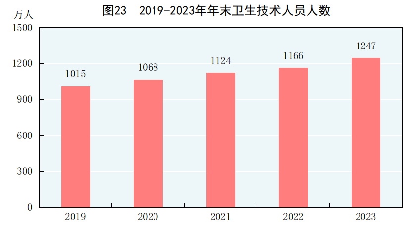 年末全國共有醫(yī)療衛(wèi)生機(jī)構(gòu)107.1萬個(gè),其中醫(yī)院3.9萬個(gè),在醫(yī)院中有公立醫(yī)院1.2萬個(gè),民營醫(yī)院2.7萬個(gè);基層醫(yī)療衛(wèi)生機(jī)構(gòu)101.6萬個(gè),其中鄉(xiāng)鎮(zhèn)衛(wèi)生院3.4萬個(gè),社區(qū)衛(wèi)生服務(wù)中心(站)3.7萬個(gè),門診部(所)36.2萬個(gè),村衛(wèi)生室58.3萬個(gè);專業(yè)公共衛(wèi)生機(jī)構(gòu)1.2萬個(gè),其中疾病預(yù)防控制中心3426個(gè),衛(wèi)生監(jiān)督所(中心)2791個(gè)。衛(wèi)生技術(shù)人員1247萬人,其中執(zhí)業(yè)醫(yī)師和執(zhí)業(yè)助理醫(yī)師478萬人,注冊護(hù)士563萬人。醫(yī)療衛(wèi)生機(jī)構(gòu)床位1020萬張,其中醫(yī)院800萬張,鄉(xiāng)鎮(zhèn)衛(wèi)生院151萬張。全年總診療人次[75]95.6億人次,出院人次[76]3.0億人次。