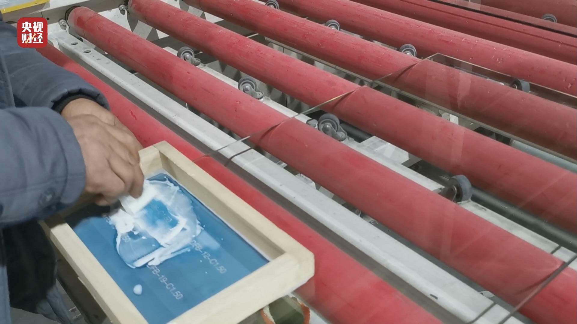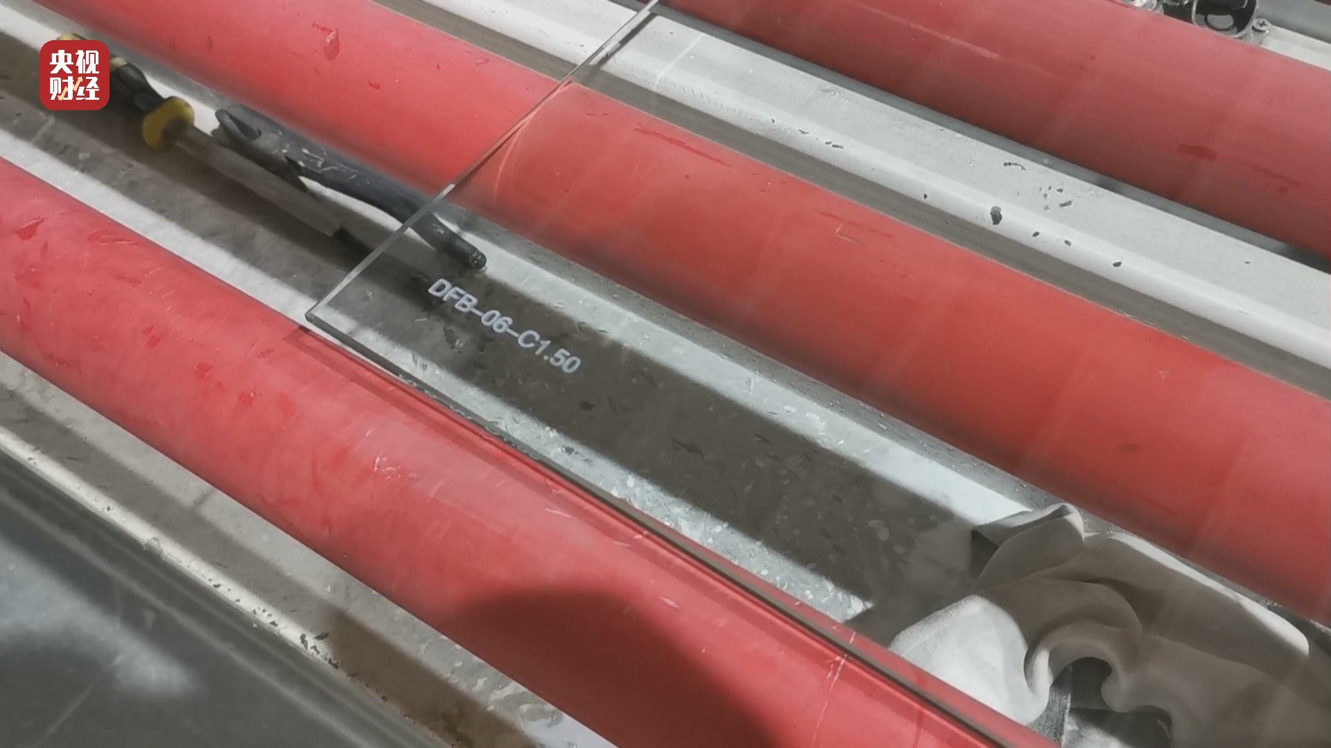 但是記者看到,同時跟樣品玻璃一起鋼化的另一批玻璃,在生產(chǎn)線上也被打上了防火標志,然而整個生產(chǎn)過程,記者并沒有看到給這些玻璃噴防火液以及晾干的工序。