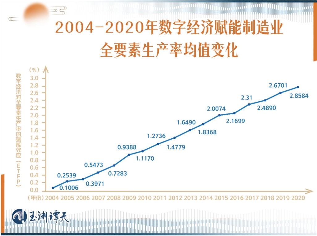 有學(xué)者做過測(cè)算,從2004年開始到2021年,數(shù)字經(jīng)濟(jì)賦能制造業(yè)全要素生產(chǎn)率效能呈逐年上升的趨勢(shì),且近年來,賦能均值達(dá)到了最高點(diǎn)。
