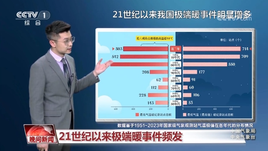 氣象分析師 胡嘯:我們統計了上世紀50年代以來氣溫創(chuàng)紀錄的站點,從白天的國家級氣象站創(chuàng)紀錄站點來看,有百分之七十都出現在21世紀,近三年數量達到了503個,在這其中有六成站點的極端最高氣溫都突破了40℃。不僅白天的氣溫高,夜間的氣溫也很高,大致有百分之八十的站點都出現在21世紀。近三年是達到了714個,這要比以往任何十年的累加都要多。
