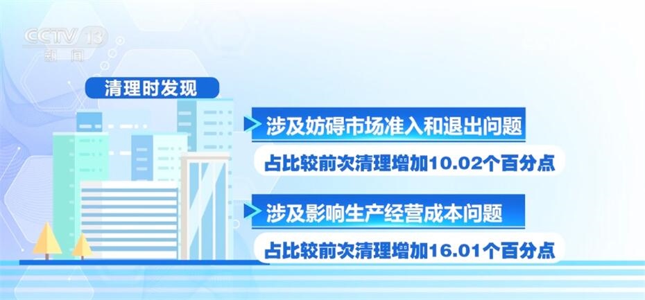市場監(jiān)管總局表示,本次清理工作雖然取得顯著成效,但在清理時還發(fā)現(xiàn)涉及妨礙市場準入和退出、影響生產經營成本等領域問題占比較前次清理分別增加10.02和16.01個百分點,涉及妨礙商品和要素自由流動領域問題仍然較為突出。