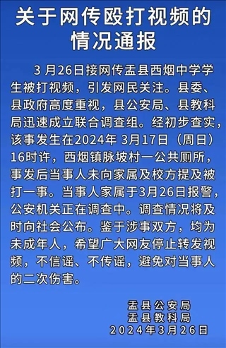 ·官方通報(bào)“山西盂縣一學(xué)生在公廁內(nèi)被打”:公安機(jī)關(guān)介入調(diào)查。