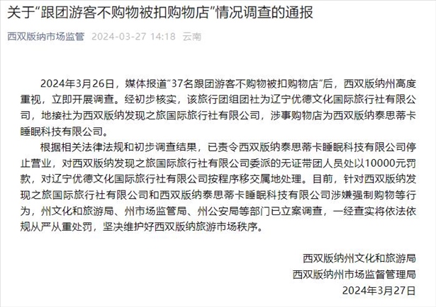 ·云南西雙版納通報(bào)“37名跟團(tuán)游客不購物被扣購物店”調(diào)查情況:立案調(diào)查。