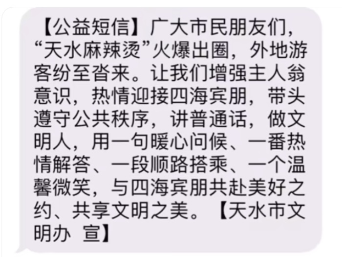 事實上,自3月以來天水在網(wǎng)絡(luò)“出圈”后,游客就絡(luò)繹不絕。有多位當(dāng)?shù)鼐W(wǎng)友“曬”的消息顯示,3月20日收到天水市發(fā)布的“公益短信”,建議當(dāng)?shù)厥忻瘛霸鰪?qiáng)主人翁意識,熱情迎接四海賓朋……用一句暖心問候、一番熱情解答、一段順路搭乘、一個溫馨微笑,與四海賓朋共赴美好之約……”